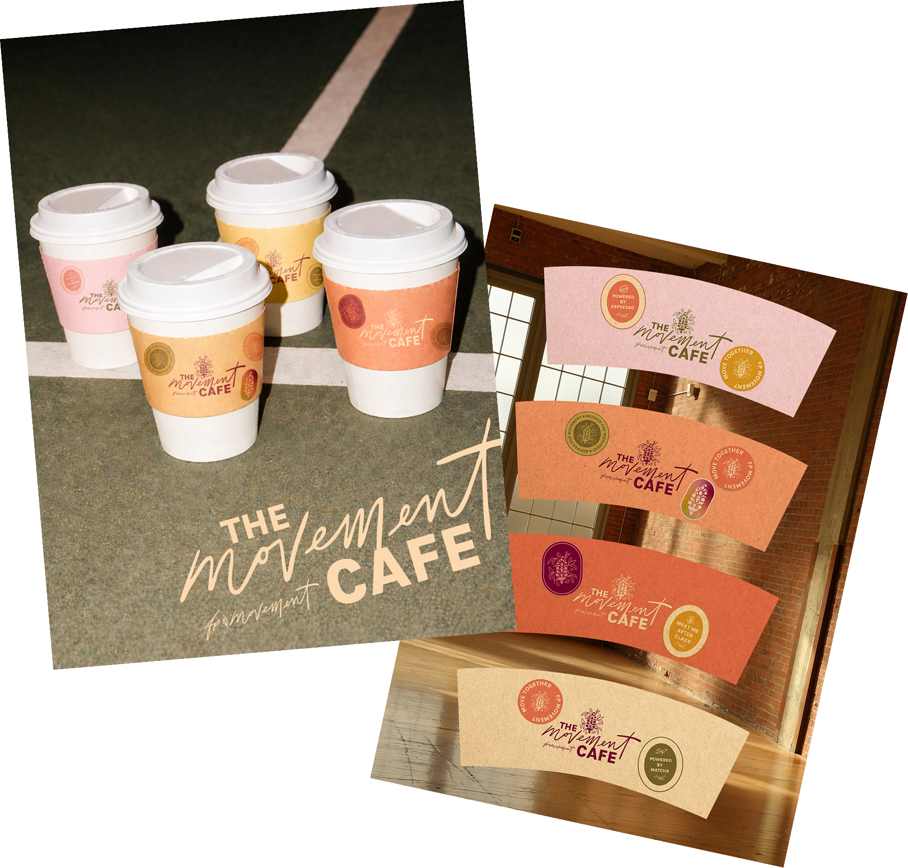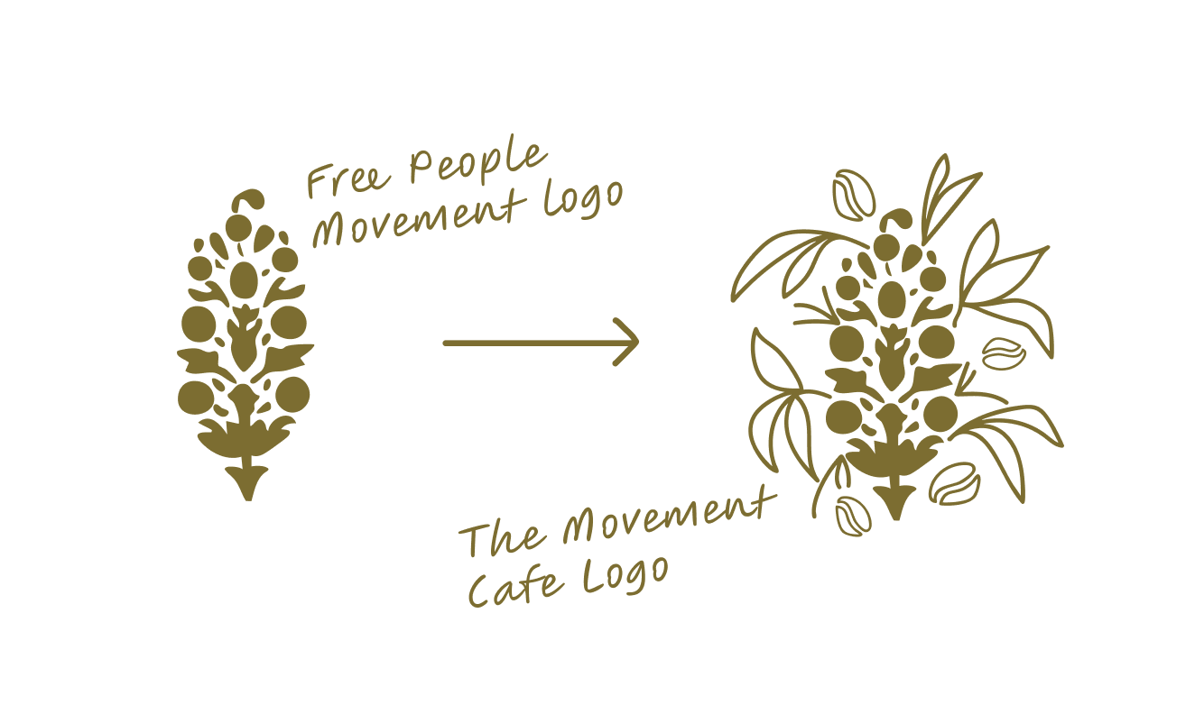 The FP Movement logo serves as the foundation for The Movement Café’s visual identity. Rather than redesigning the mark, its core elements are preserved and thoughtfully expanded upon to create a version that feels specific to the café while remaining unmistakably FP Movement.