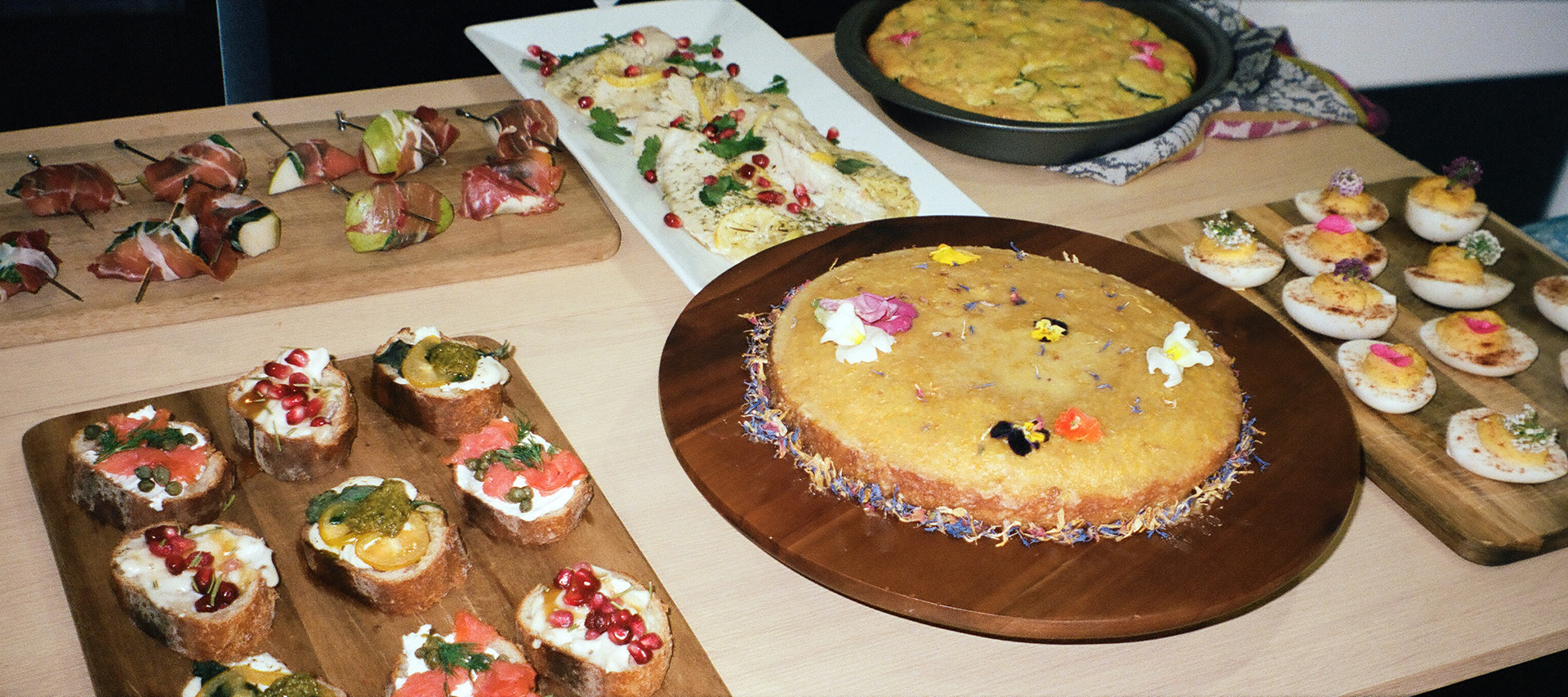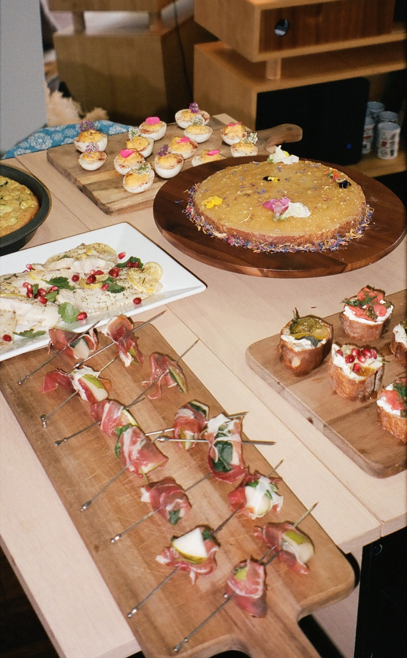 The Spread: tilapia, zucchini pie, prosciutto wrapped asian pear, deviled eggs, octopus salad, beet salad, crostini, lemon poppyseed crepes, and orange cardamom olive oil cake.